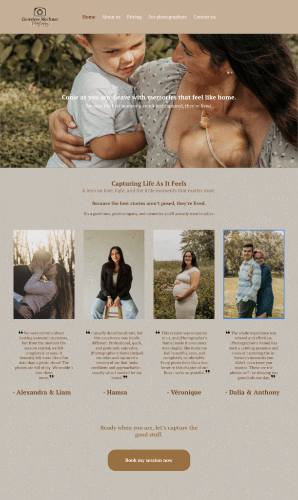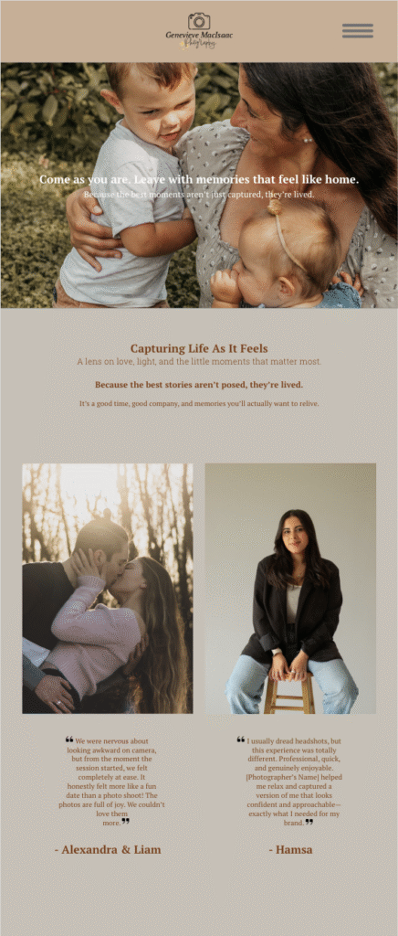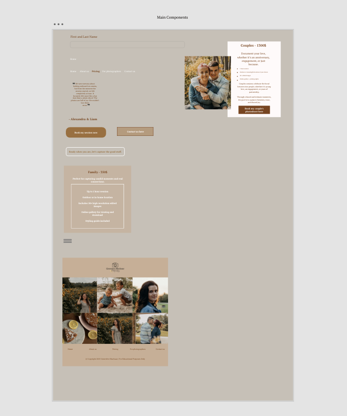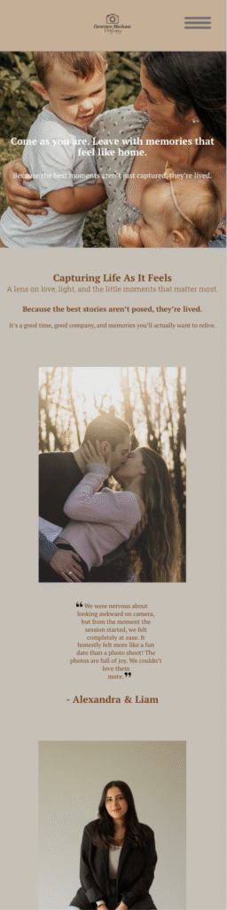 For my second coded website, Geneviève MacIsaac Photography, I created a high-fidelity wireframe focused on showcasing my photography services in a more immersive and visually engaging way.