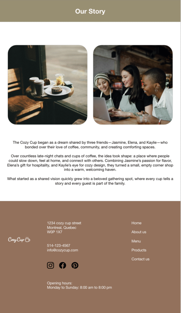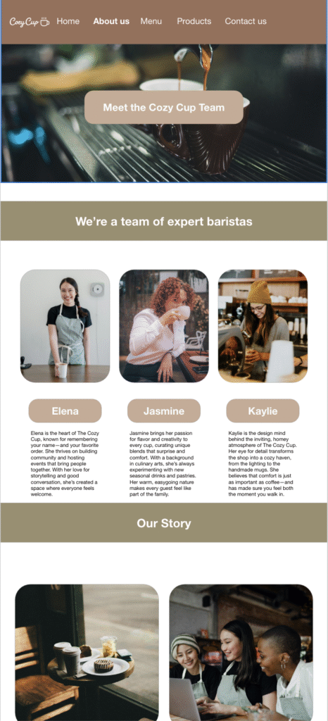 I discovered UI/UX design for the first time while working on a school project: a coffee shop website I named The Cozy Cafe. Intrigued by the idea of creating something both functional and visually appealing, I used Adobe XD to design my first website wireframe. The learning curve was steep at first, especially as I navigated through the interface and tried to understand how everything fit together. One of the most rewarding parts of the process was building the color palette and developing my own character styles. It felt like I was giving the brand its own personality. However, components and interactivity were by far the most challenging aspects. Figuring out how to make reusable elements and link them together for a seamless user experience took time and experimentation. Despite the obstacles, the project gave me a solid foundation and a new passion for design.